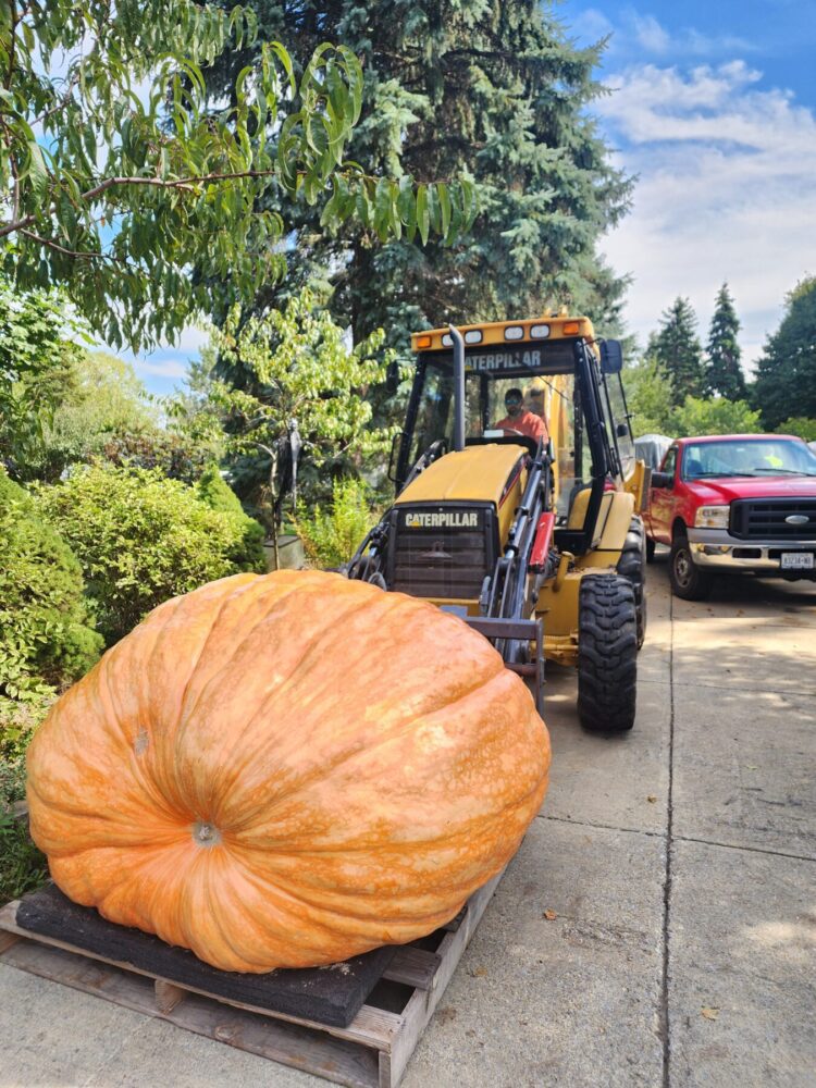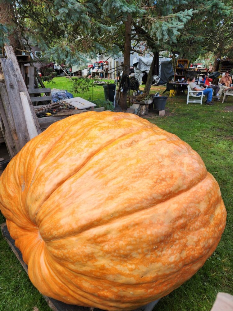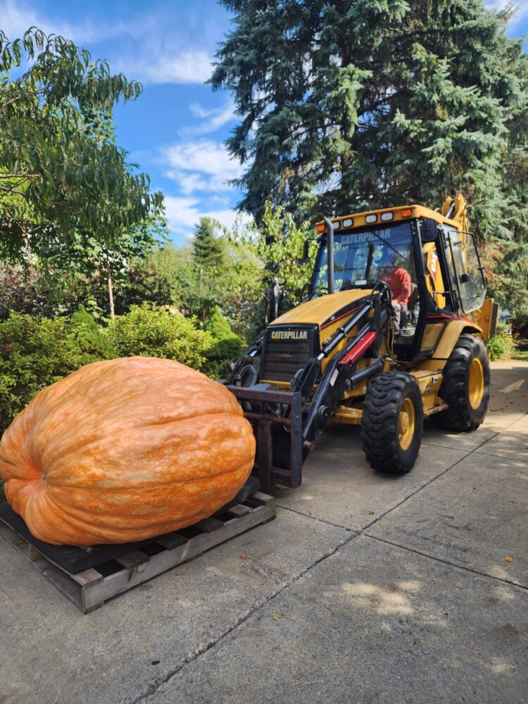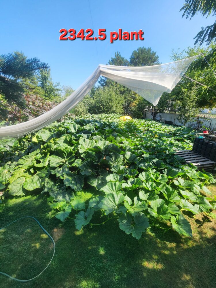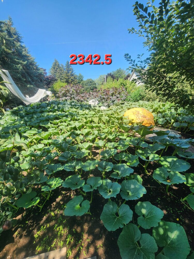 The 2114.5 Andrusz was grown from the 2342.5 andrusz we grew in 2024. This year we grew two 2342.5 Andrusz seeds. One ended up 2114.5, the other in our secondary patch made 1642 lbs as well. These 2342.5 seeds have massively aggressive plants and excellent shaped pumpkins. ORANGE! So far, the 2342.5 Andrusz plants have proven to be the most clone like and consistently similar plants we have seen. All showing very much aggression and good natural resistance to envinmental factors as well. Unfortunately, the 2114.5 Andrusz had a rabbit nest under the crown that went unseen for too long, leading to a hole in the main vine which further infected the main vine as the season progressed. Unfortunately this pumpkin slowed down and stopped as a result which was very disappointing as we had very high expectations for this one. This plant was an ABSOLUTE MONSTER.
